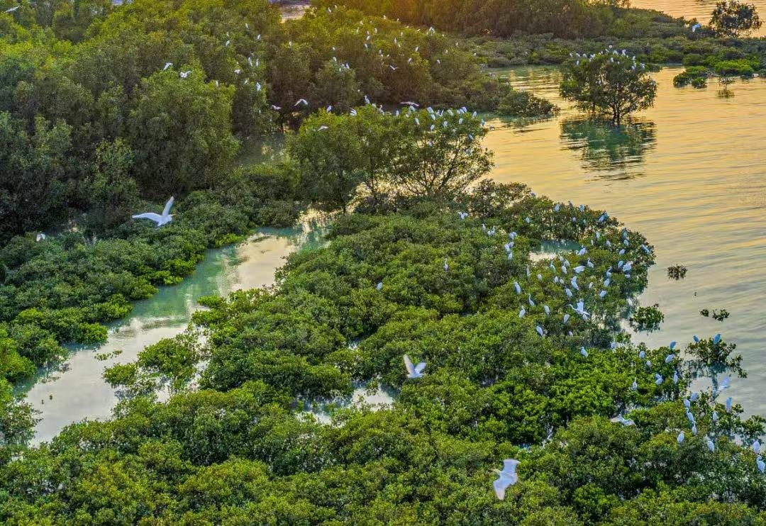 然而,秋季白鹭迁徙而至时总会啄食虾苗,望着养殖户沉默收网的背影,村干部老肖不禁感慨:“虾塘简直成了白鹭的自助餐厅!”从敲锣打鼓、燃放轰天炮,到激光、彩带干扰,再到声波驱鸟,我同村干部一起摸索,集思广益,不仅让虾苗损耗终得控制,红树林的鸟类栖息量竟也增加了。如今,村里与南海水产研究所合作的“红树林种养耦合”项目已落地,红树林下的底栖生物成为青蟹天然饵料,红树林也从单纯的防护墙,变成生态经济的转换器。而那些曾让村民头疼的白鹭,也化身为生态旅游的活招牌。
